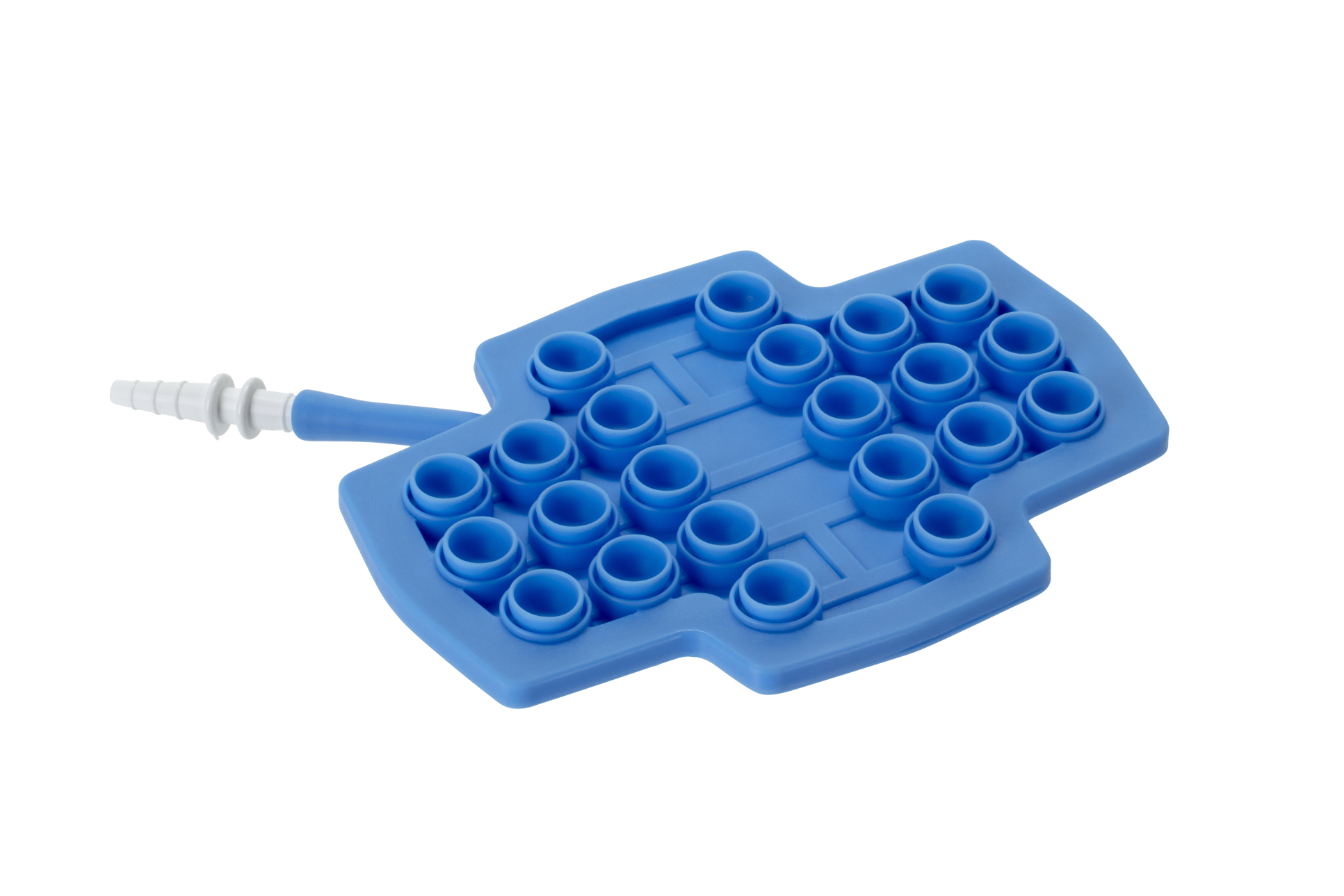 Die Nackenmatte ist, mit einer Größe von 11cm x 15cm, die kleinste der drei Schröpfmatten und deshalb besonders gut an kleinen Flächen anwendbar, wo die größeren Matten keinen Platz finden würden. Durch ihre Form ist sie speziell für die Anwendung im Nacken konzipiert und sorgt dort für Linderung von Migräne und Verspannungen. Die Aussparung an der Wirbelsäule ermöglicht eine Behandlung ohne unnötige Belastung der Wirbelsäule. Dies hat besondere Relevanz bei der Behandlung von Kindern und Jugendlichen.